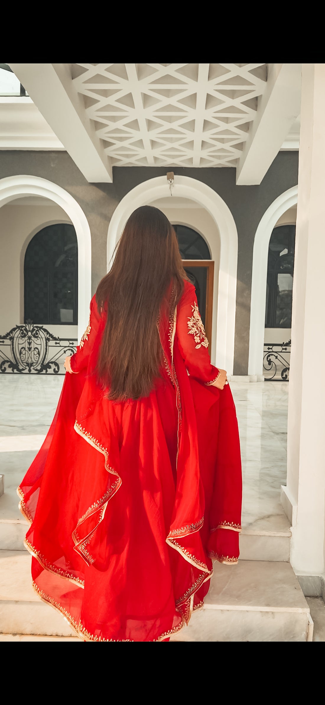 Our signature Surkh double Flared Frock in chiffon with Hand embellishment and embroidery perfect for...