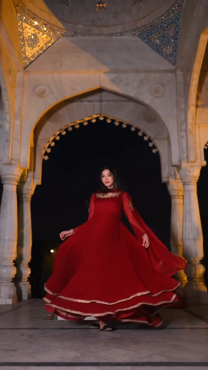 Noor Jahan Red Flared Long Frock, a stunning outfit to give your personality a traditional...