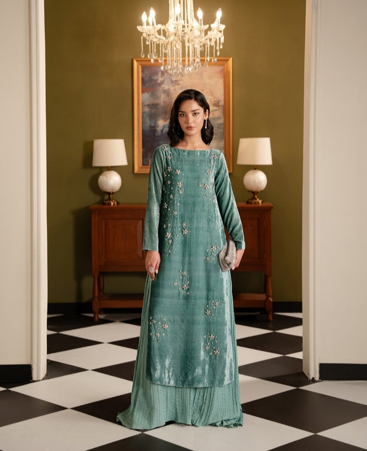 A rich velvet ensemble adorned with delicately embellished sleeves and elegant patchwork detailing on the...