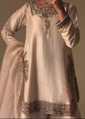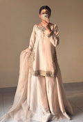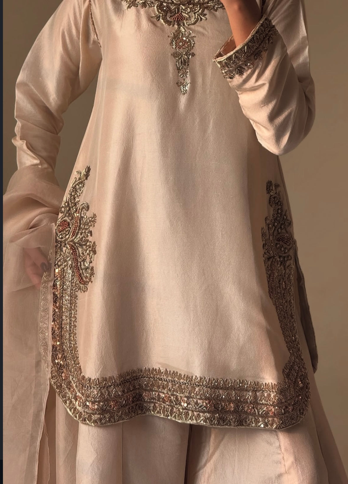 An elegant silk outfit in a soft champagne tone, beautifully adorned with delicate embellishments on the neckline, borders, and sleeves. The graceful flow and intricate detailing make it a perfect choice for festive and formal occasions, blending luxury with timeless charm. ✨