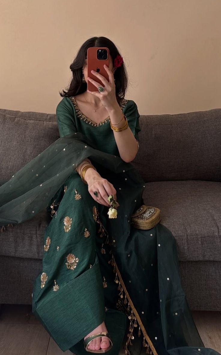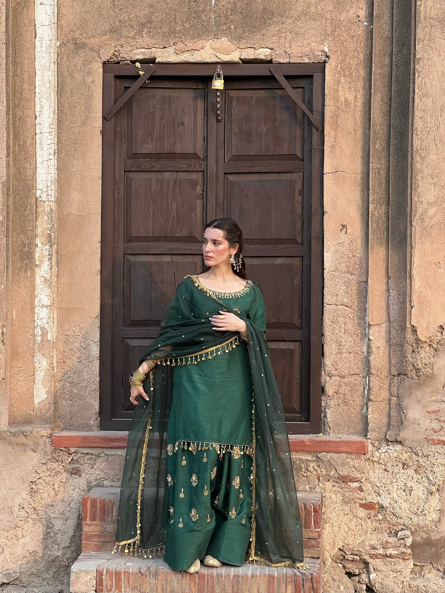 A timeless farshi shalwar set, meticulously crafted with an intricately embellished farshi shalwar and shirt. Paired with a luxurious organza dupatta, adorned with lace accents on all four sides for an elevated touch of elegance. ππ