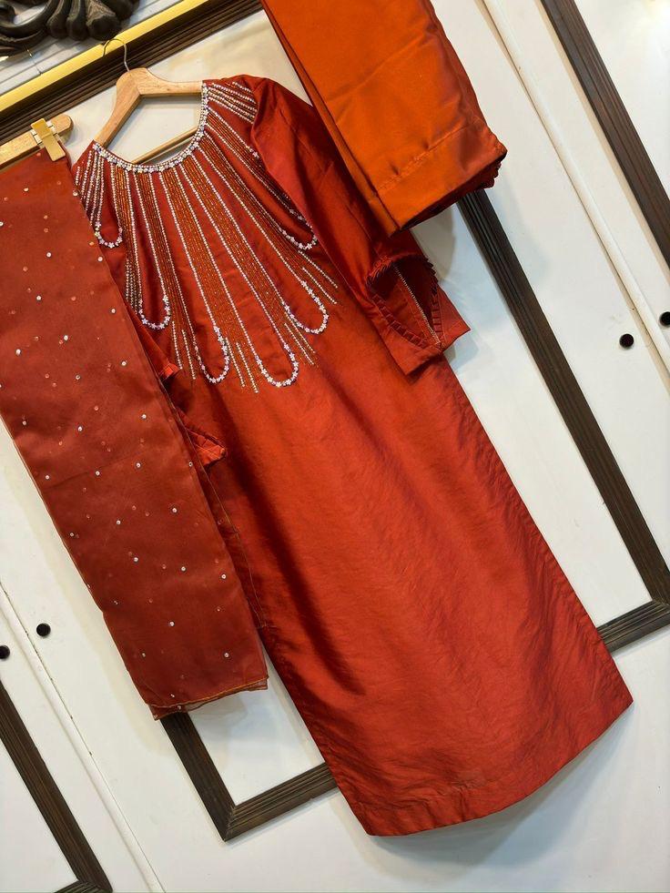 This elegant raw silk dress features delicate hand embellishments that add a subtle sparkle, beautifully complemented by a matching dupatta adorned with minimal detailing. A perfect blend of tradition and sophistication for festive and formal wear. ✨🧡