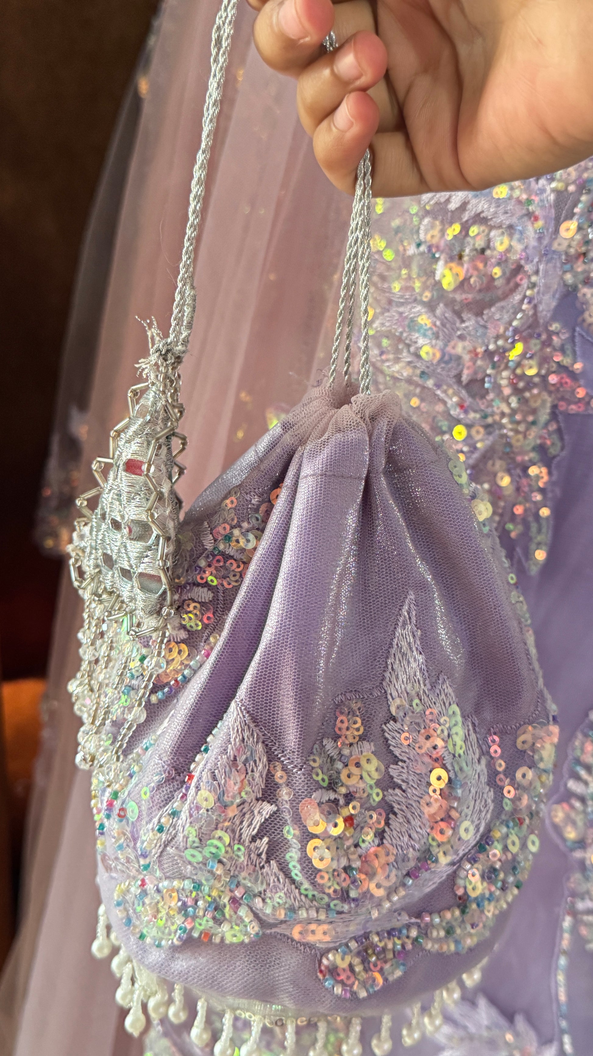 Paired with a matching embellished potli bag and a stunning hair clip this set is the perfect choice for weddings, festive occasions, and special celebrations.