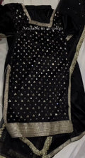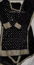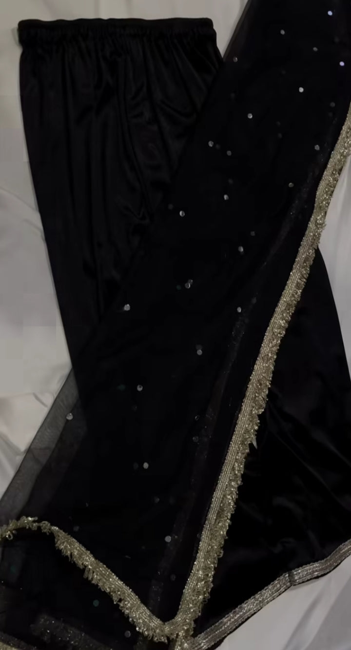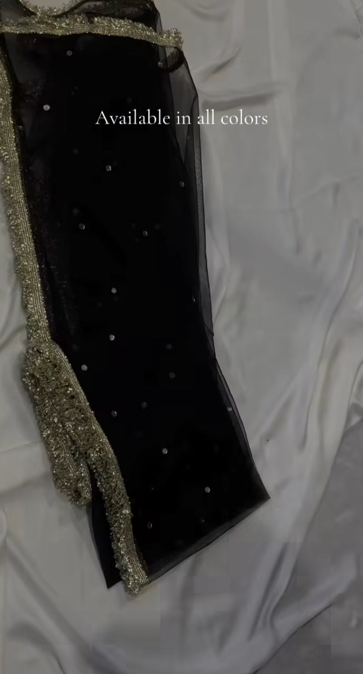 A timeless shirt adorned with delicate mirror and sitara work, beautifully finished with elegant lace details for a refined look. Paired with a soft net dupatta featuring shimmering mirror accents and graceful lace borders, this ensemble exudes subtle glamour and classic charm—perfect for festive evenings and special occasions. ✨