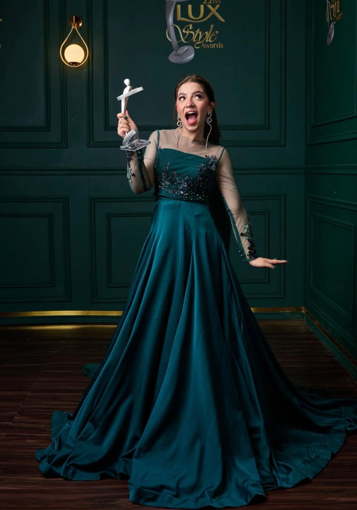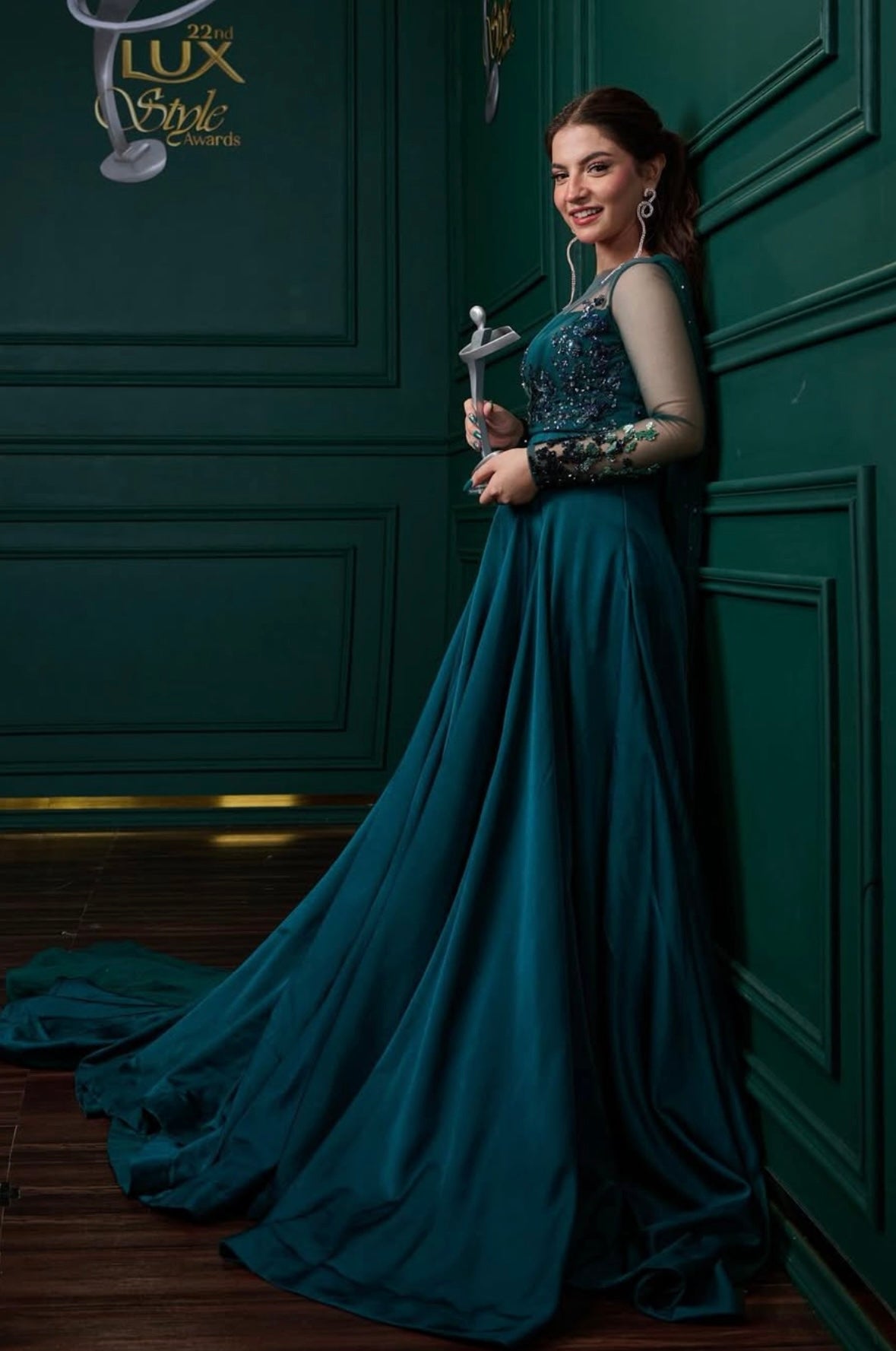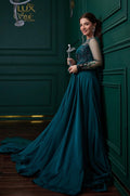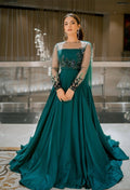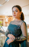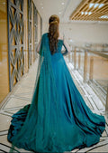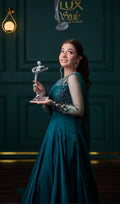 Sea green gown design lehenga choli ensemble; the net choli is hand-embellished with gradients of sequins and Swarovski crystals within intricate floral patterns. The blouse has a net drape with sequin spray attached on one side of the shoulder and is paired with a large flared silk skirt with a trail.