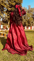 This rich maroon Maya dress in premium raw silk radiates modern elegance. Featuring statement puff sleeves, a flattering fitted bodice, and graceful flare, it's the perfect fusion of modesty and style.