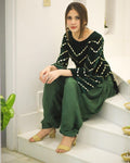 This stunning deep green velvet shalwar kameez is a perfect blend of tradition and elegance. The kameez features eye-catching mirror-work arranged in a stylish chevron pattern, giving it a modern festive touch. Paired with a beautifully draped green Patiala shalwar and a soft tissue dupatta embellished with mirror details and scalloped edges, this outfit creates a graceful and timeless look.