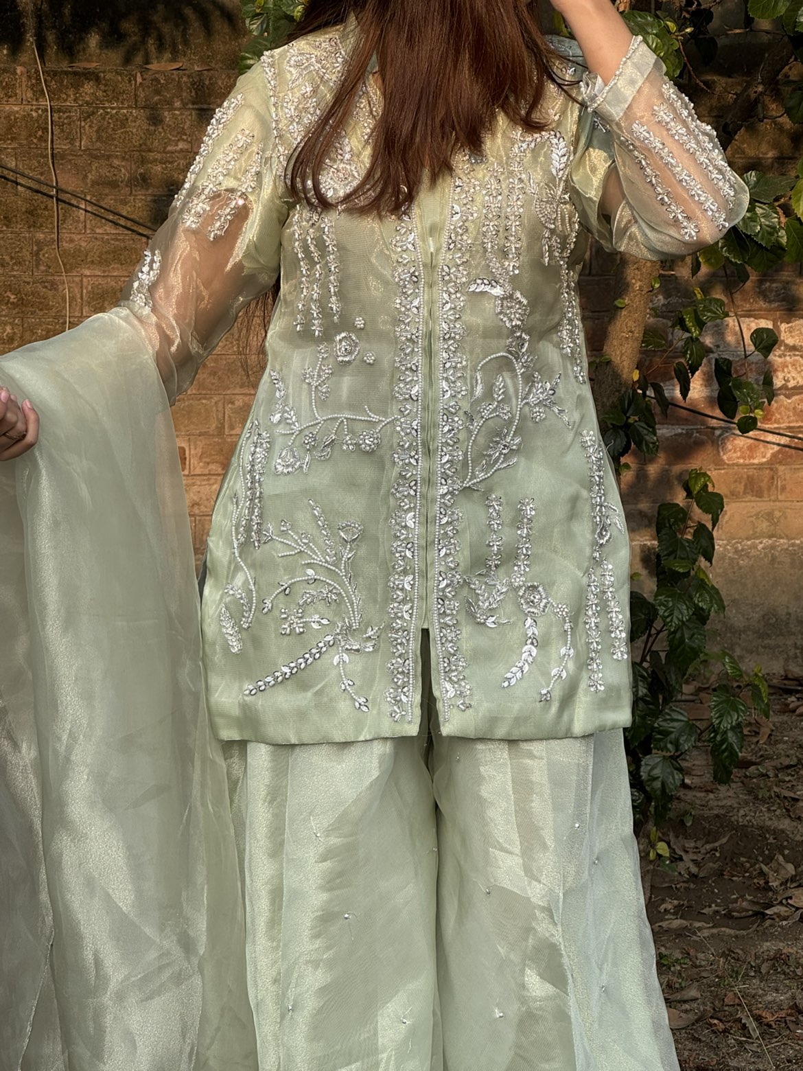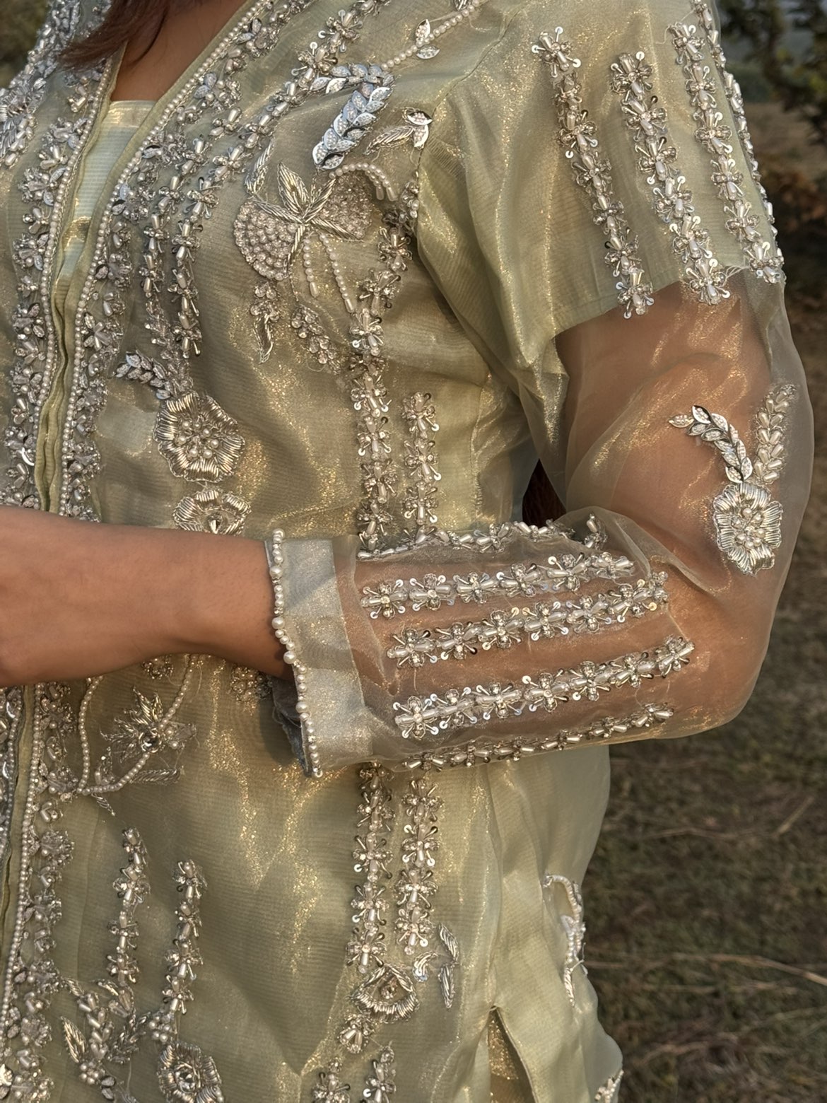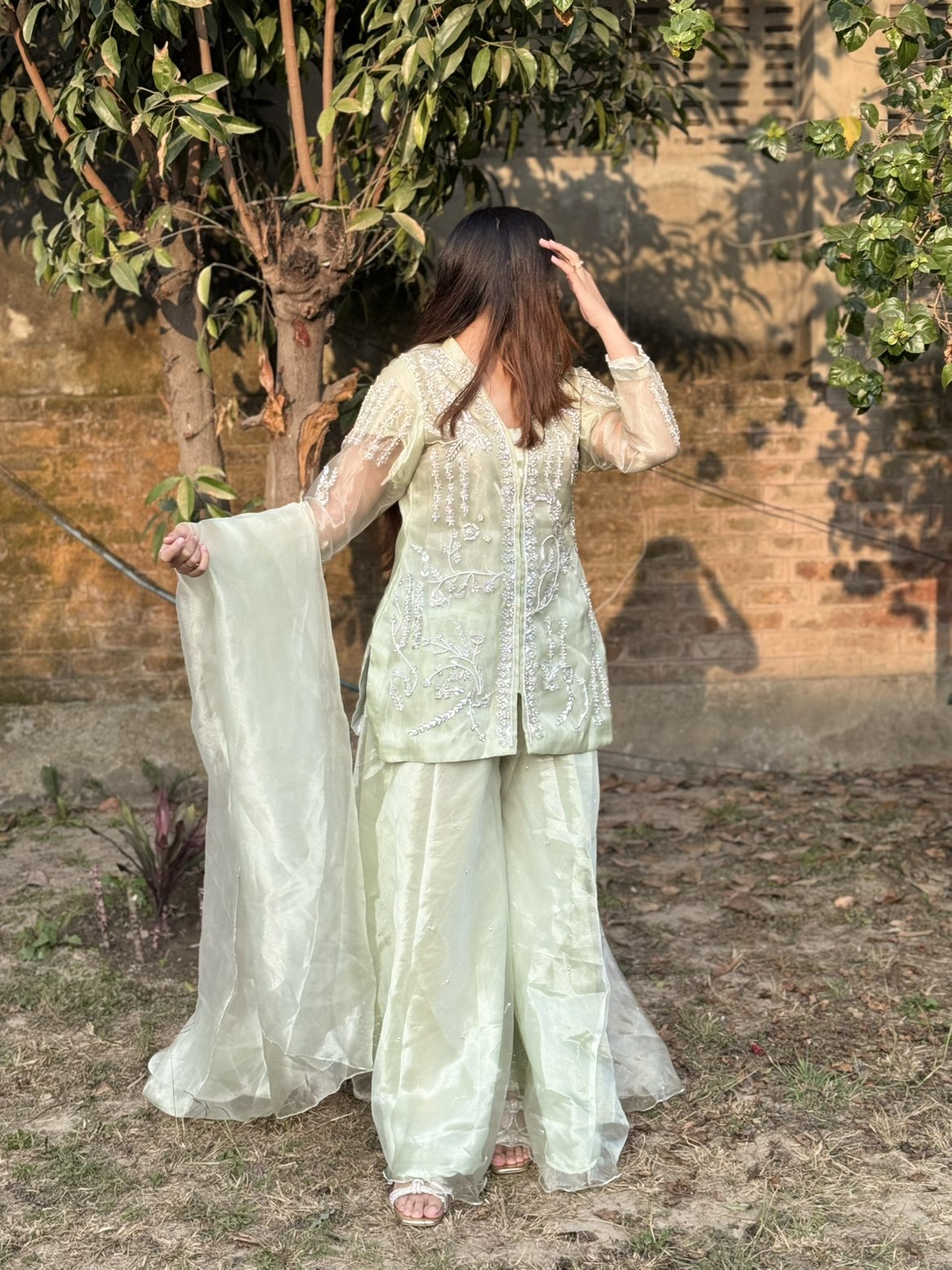 Fresh, Chic and effortessly elegant — it is a short, stylish jacket in an ethereal kiwi mint hue that feels like a breath of spring. Crafted from the softest pure organza from the jacket to the graceful flared pants also made from pure organza for the dreamiest feel.