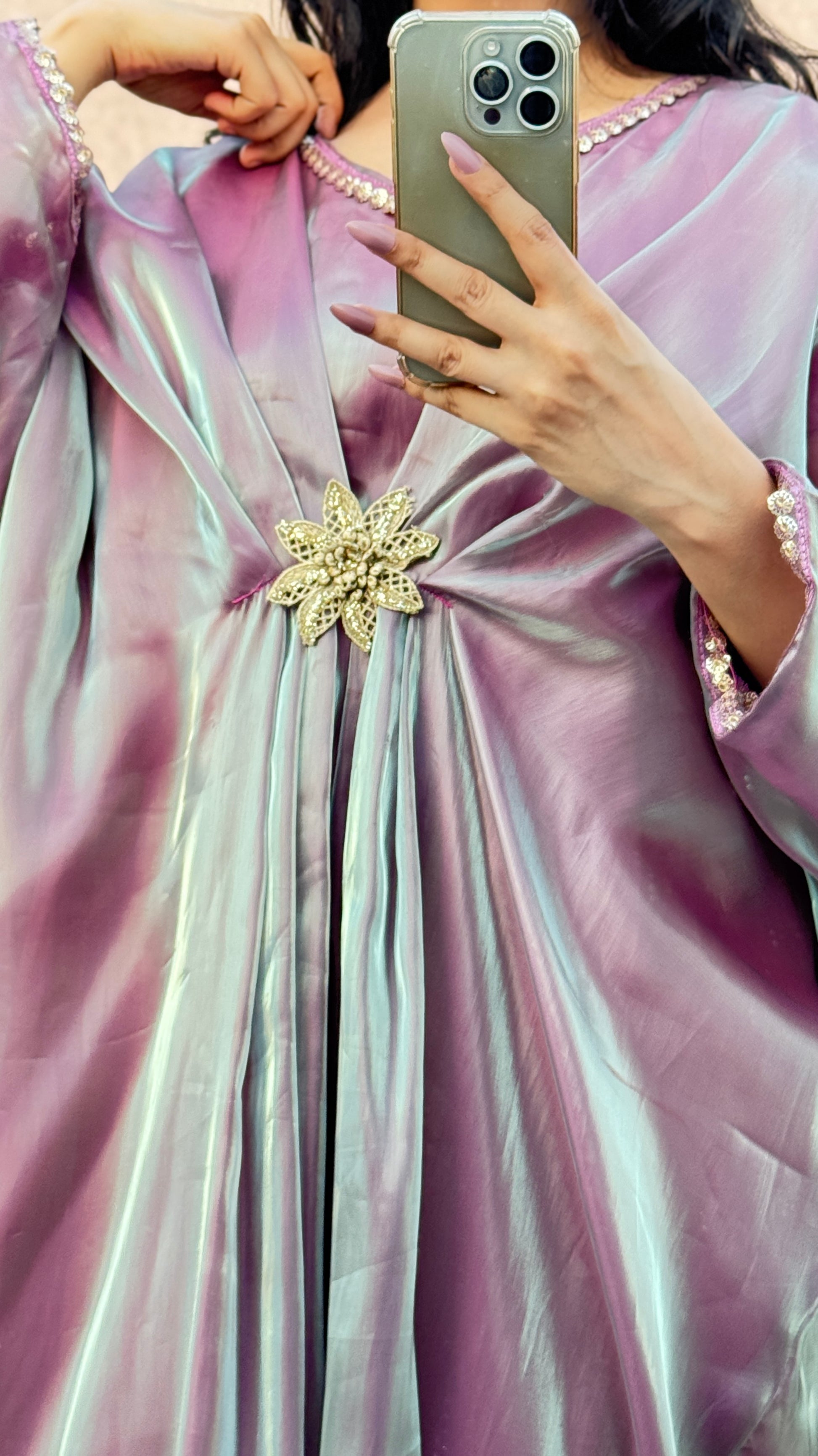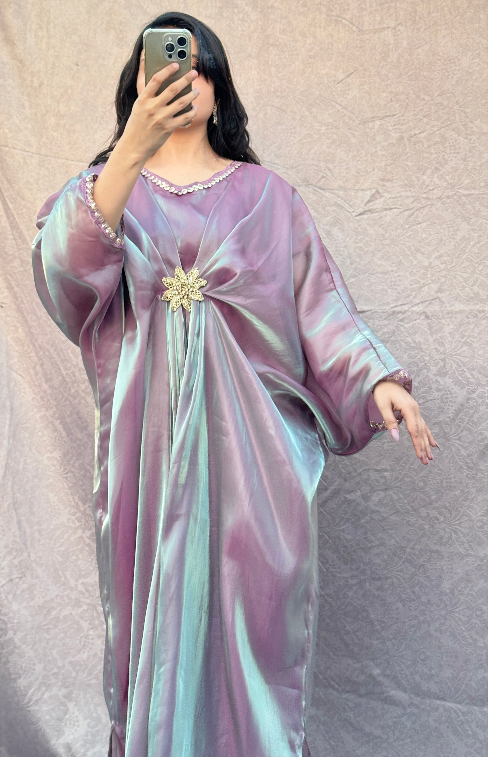 Step into elegance with this stunning shiny iridescent kaftan by Styled by Merram!