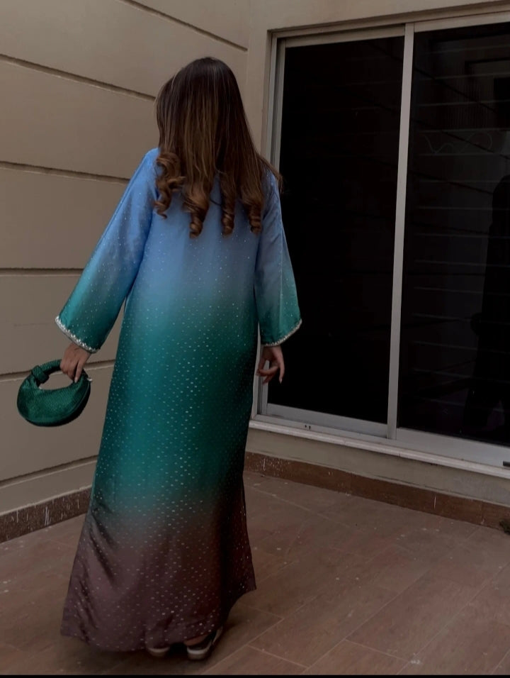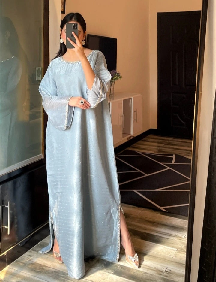 a luxurious sheesha silk kaftan crafted in a soft Ice blue shade that shines beautiful in every light✨