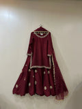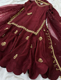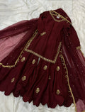 A graceful maroon sharara set adorned with delicate gold embellishments, creating a timeless festive charm. Paired with a beautifully detailed shirt featuring fine embroidery and a sheer dupatta finished with elegant lace borders and subtle embellishments, this ensemble is perfect for weddings and special occasions. ❤️