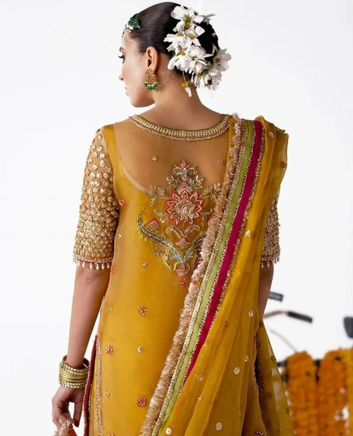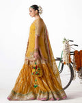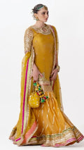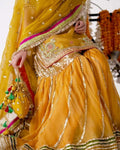 This mustard ensemble is beautifully adorned with gotta detailing and delicate moti work, enhanced with intricate borders and subtle embellishments that add timeless charm. Perfect for Mayoun Mehandi events