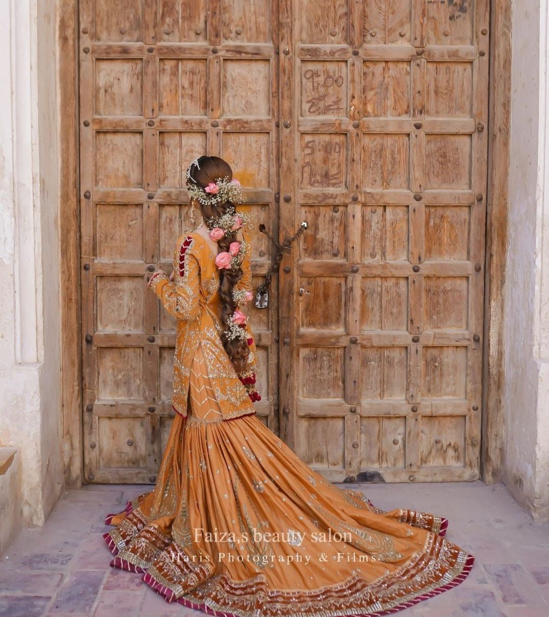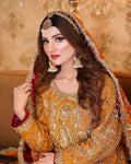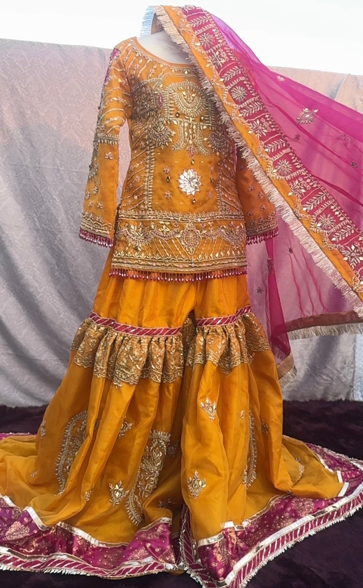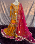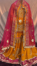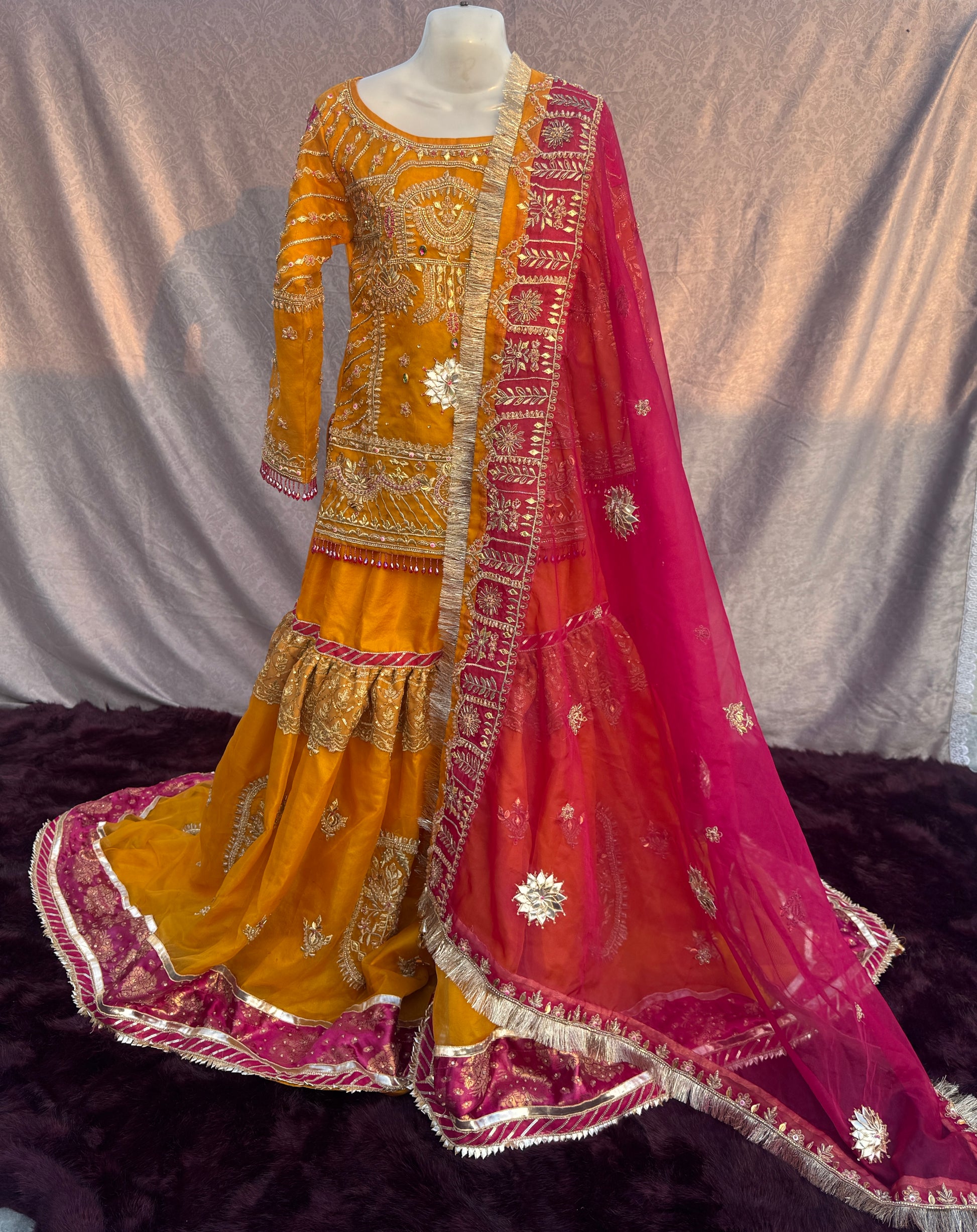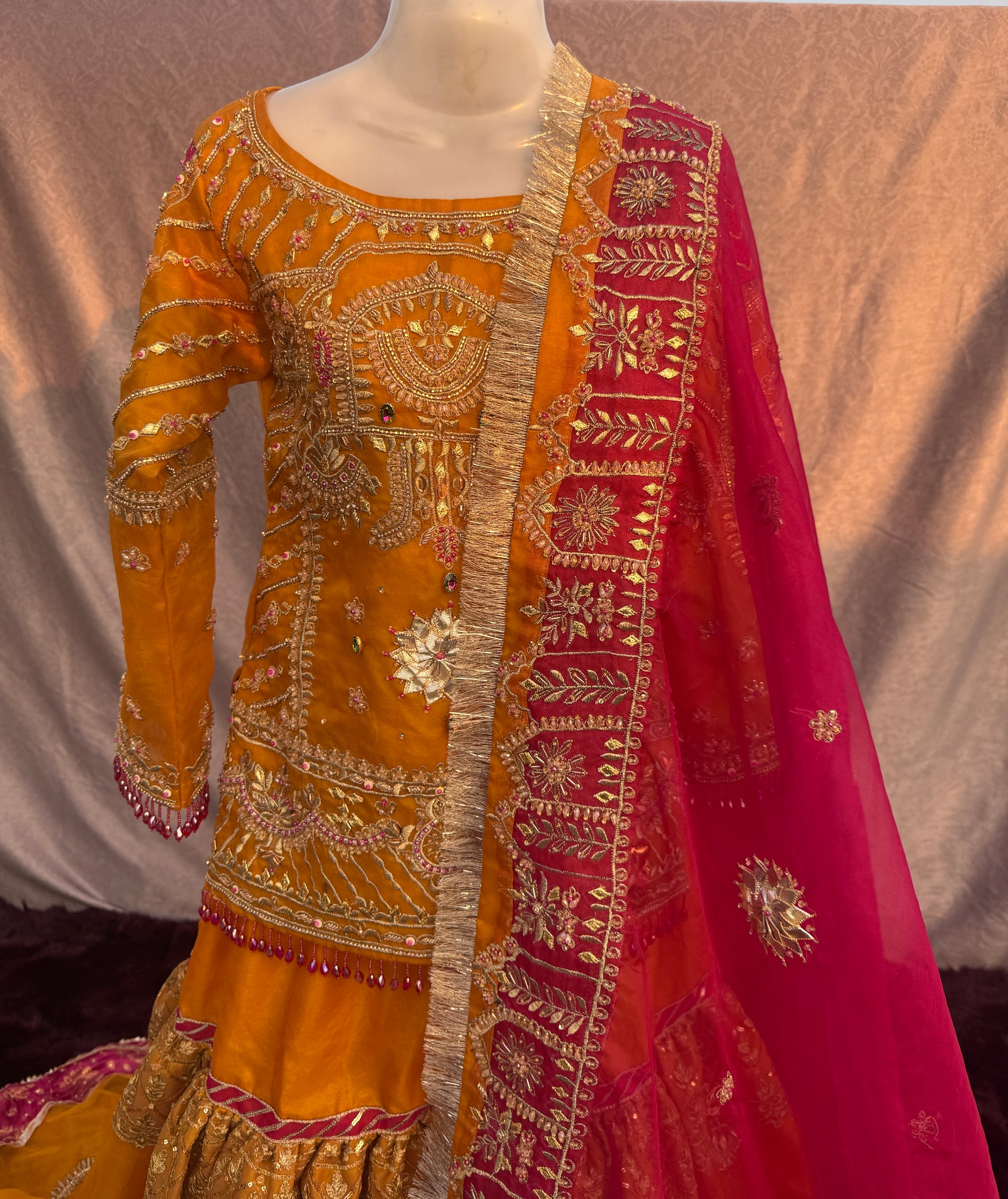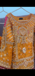 This stunning master piece Orange Mehandi dress is fully hand crafted the stunning designs machine Embroidery and hand Embellishment designing patterns everything can be customized