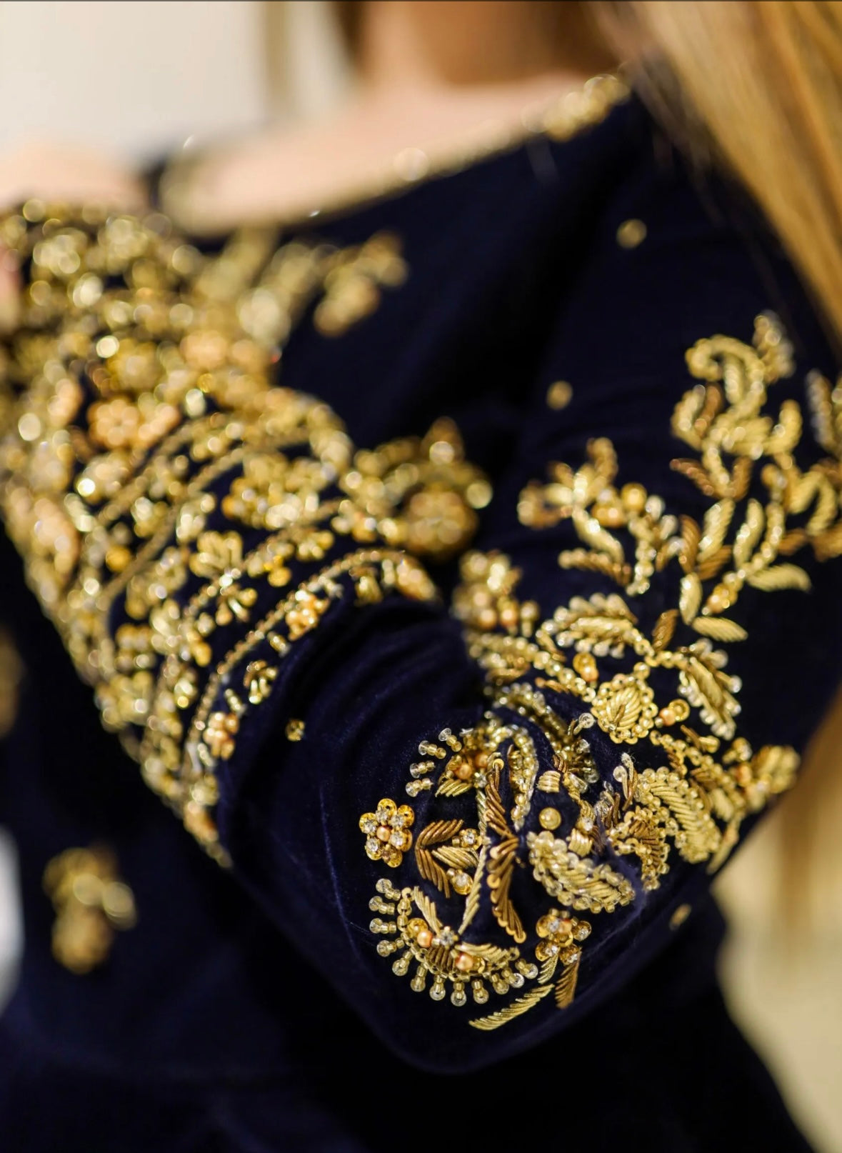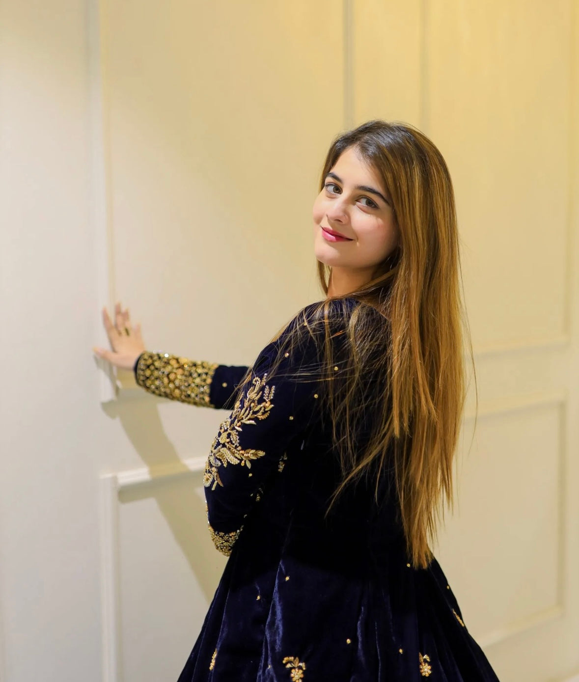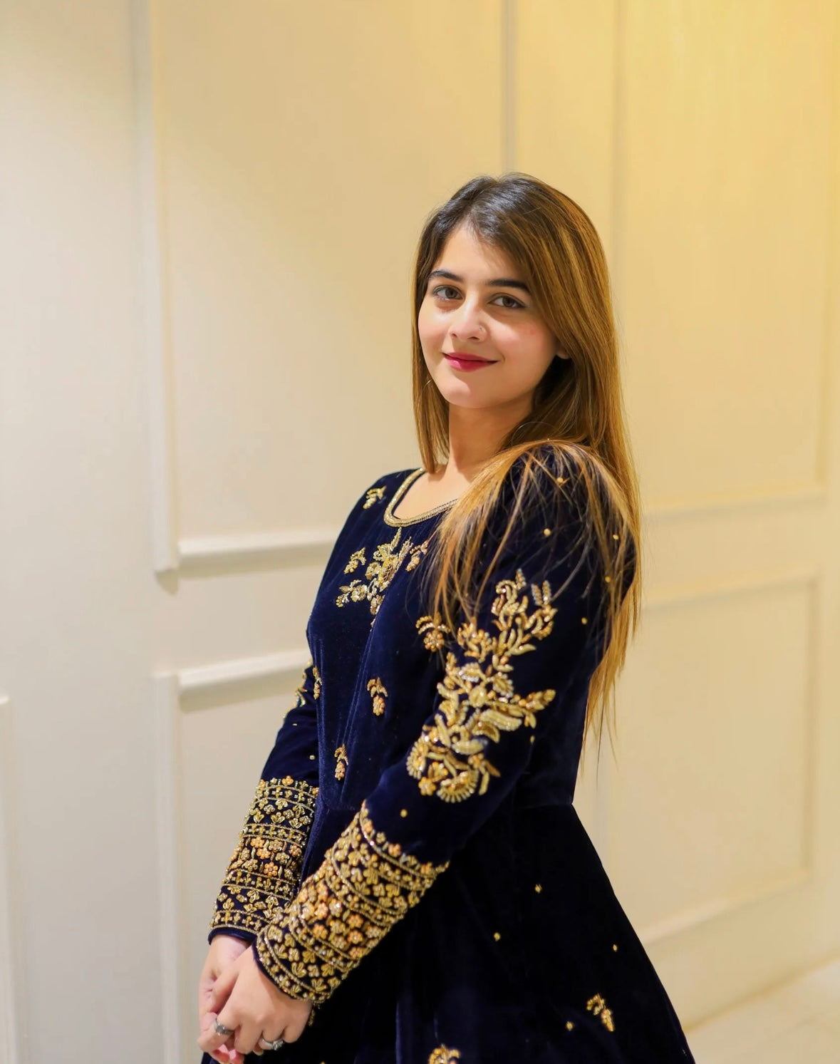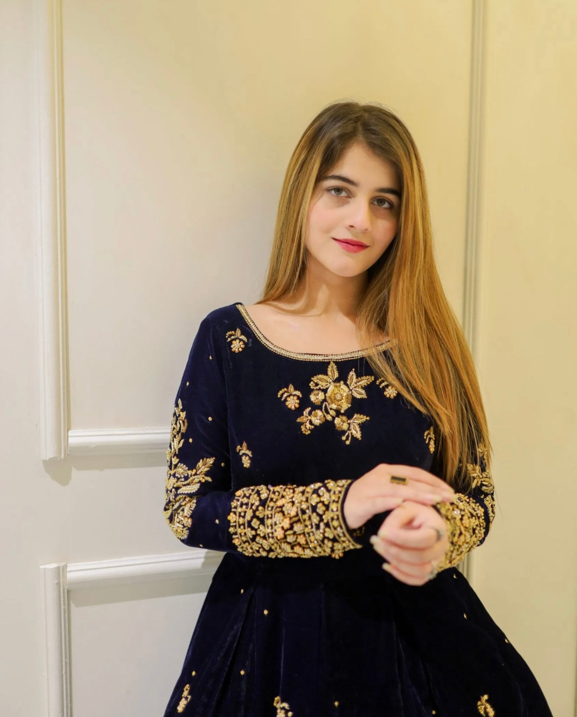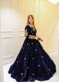A stunning navy blue velvet long dress adorned with intricate golden embroidery on the neckline and sleeves. The rich fabric and graceful full-flare silhouette with delicate motifs create a luxurious and elegant look, perfect for festive events and evening celebrations. ✨