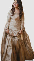 A timeless article consisting of pure tissue dupatta paired with tissue Sharrara which is delicately embellished with antique gold hand tilla, Zarri, Dabka, pearl along with sequence work. ✨👗