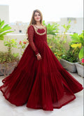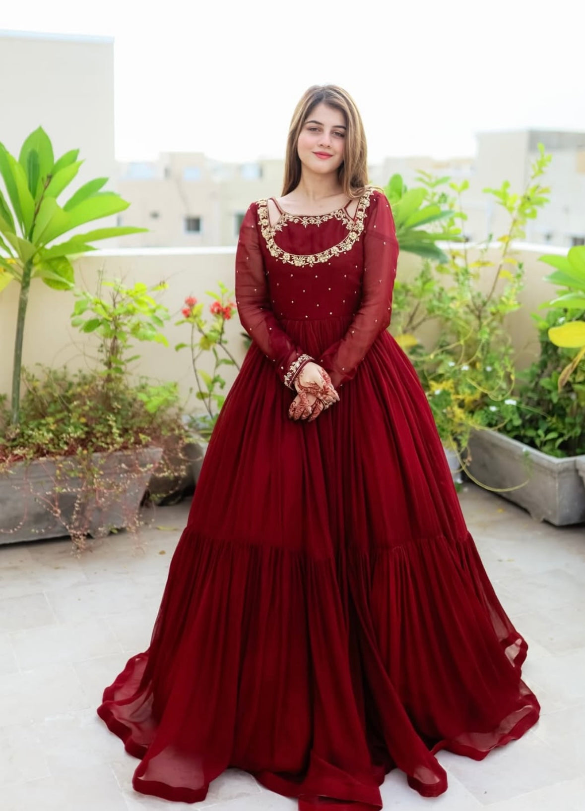 A dreamy flowy silhouette crafted in premium chiffon, adorned with delicate kora dabka embellishments on neckline and sleeves. The long flare adds a royal charm