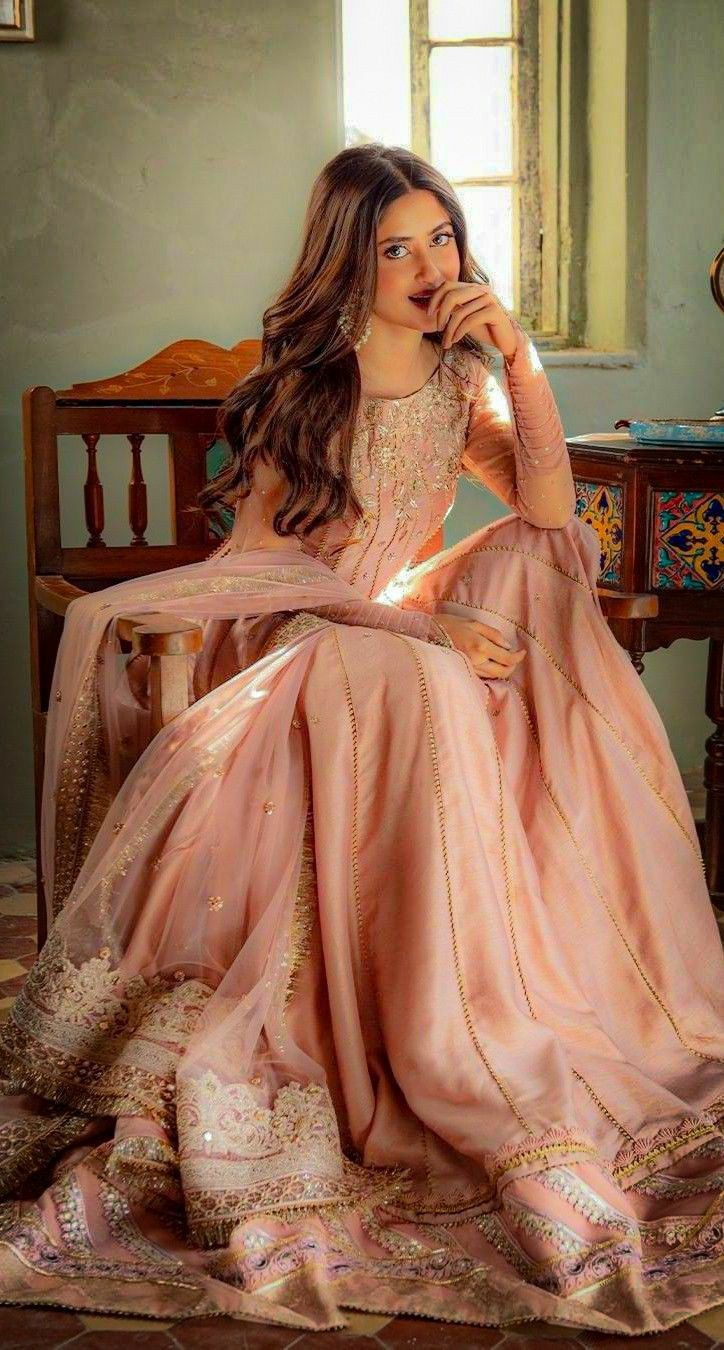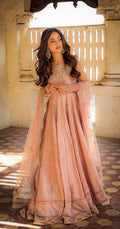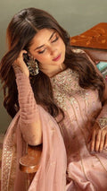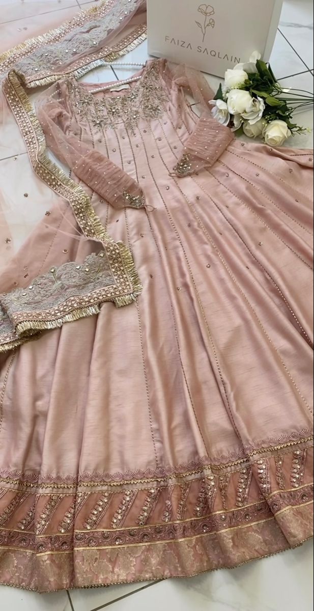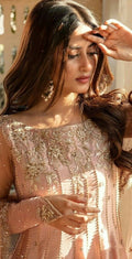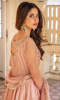 Description: A three piece daintily embellished pink kalidaar featuring traditional handwork on a bed of starry sequin