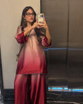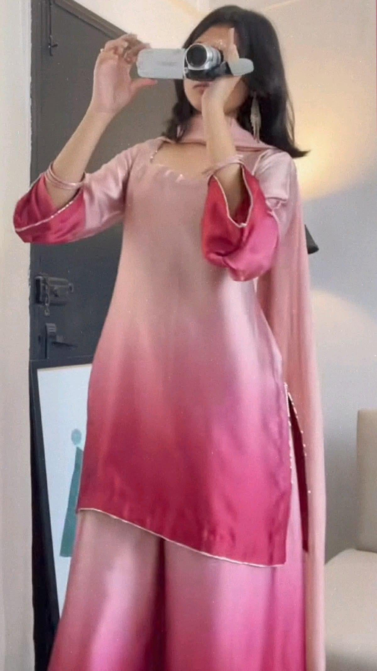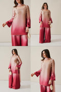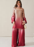 Soft, sleek, and effortlessly elegant ✨ This ombré silk ensemble blends delicate blush tones into a rich rose hue, creating a graceful statement look. The minimal neckline detailing and flared sleeves add a modern charm, while the smooth finish gives it a luxe feel — perfect for festive gatherings or intimate celebrations. 💕