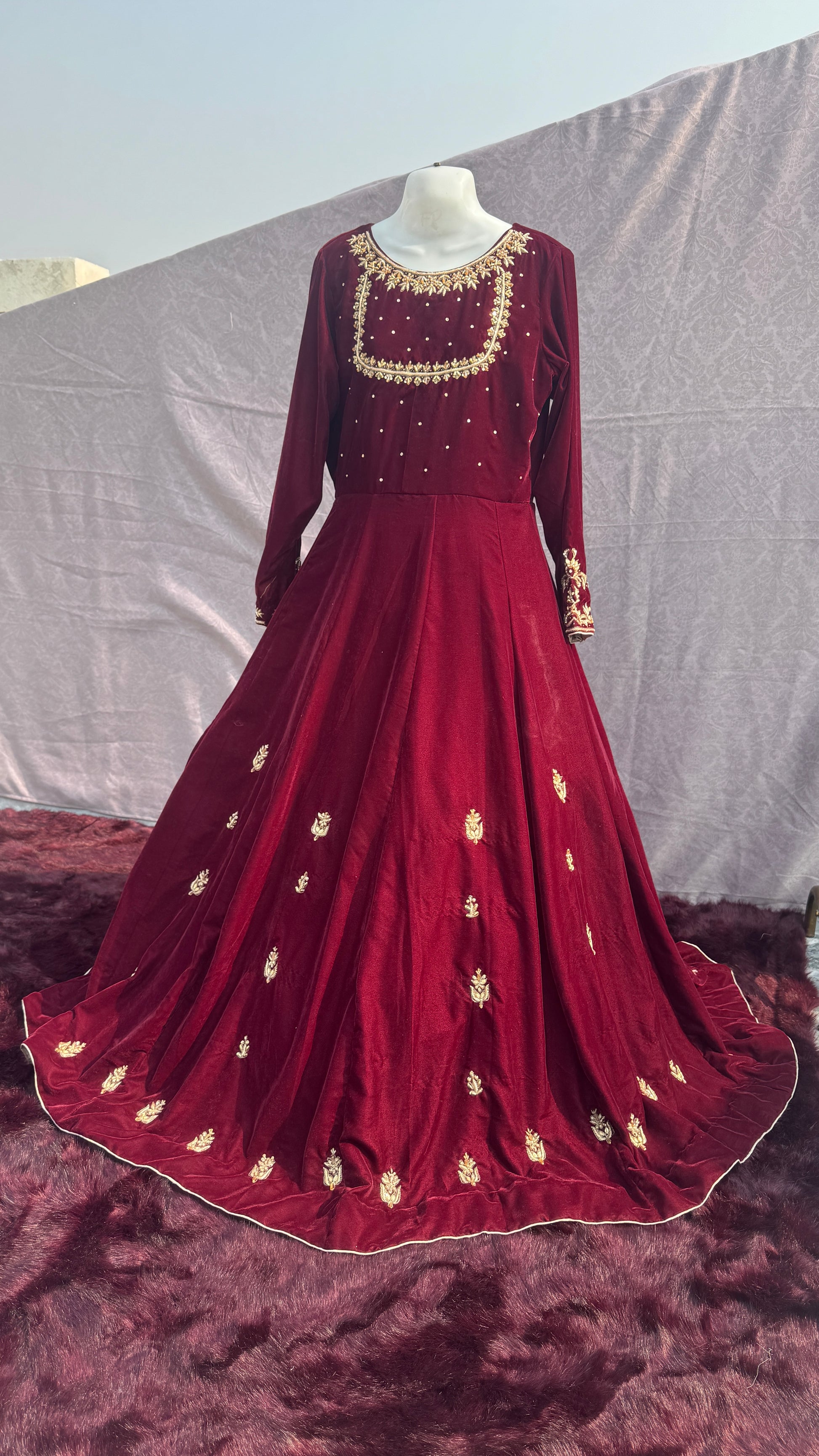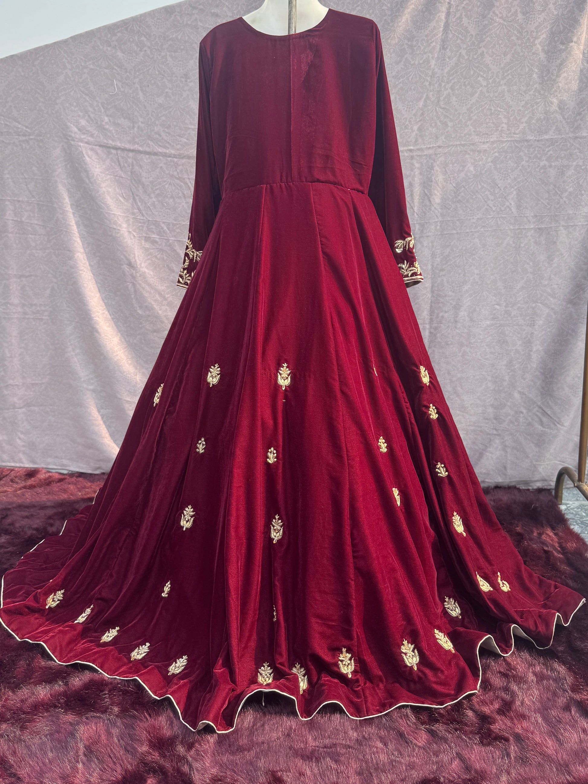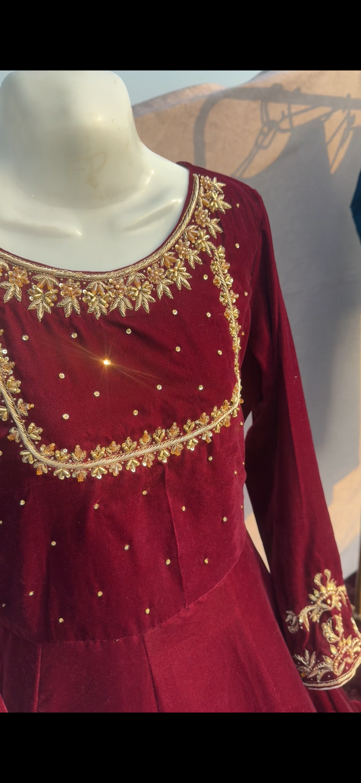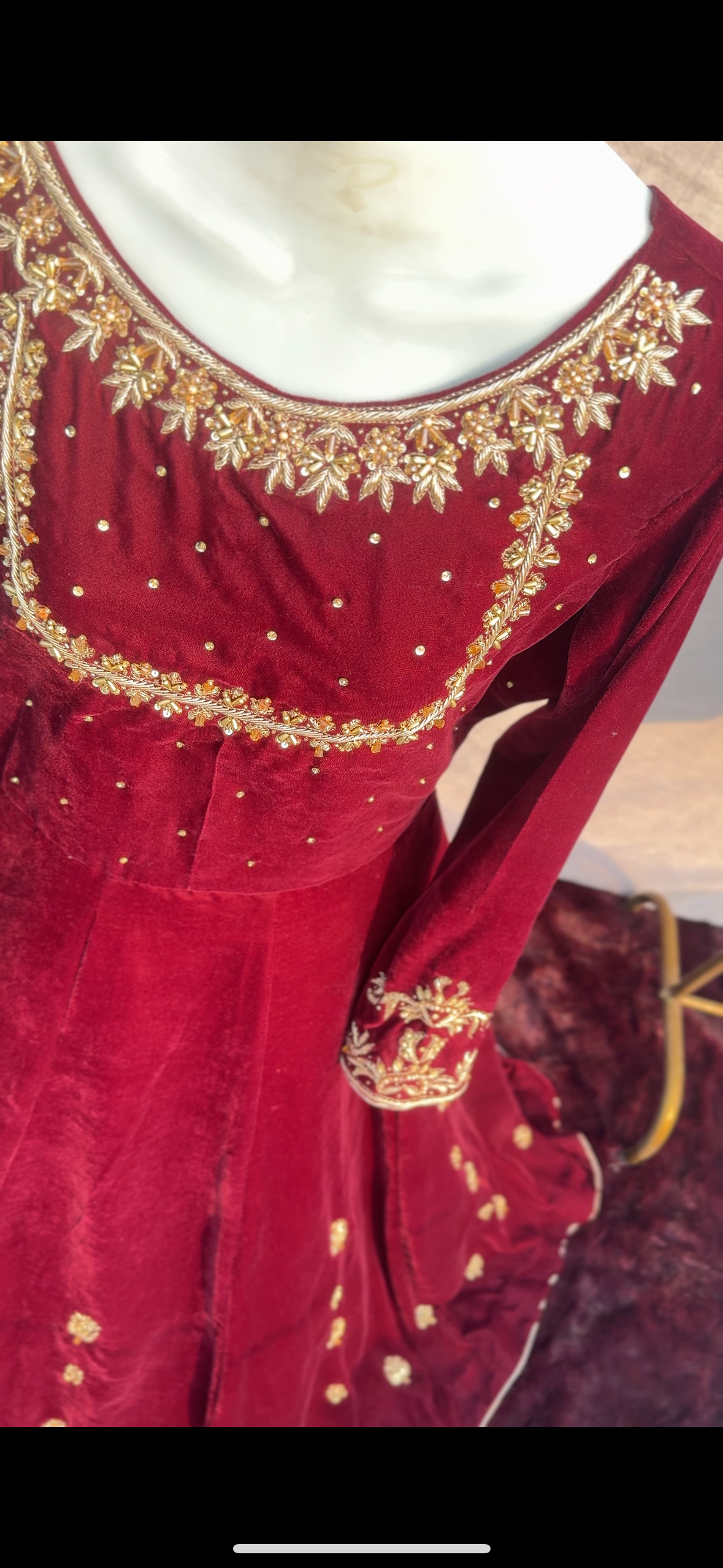 This stunning deep maroon velvet Anarkali is a perfect blend of elegance and tradition. The bodice features a beautifully crafted gold embroidered square neckline,