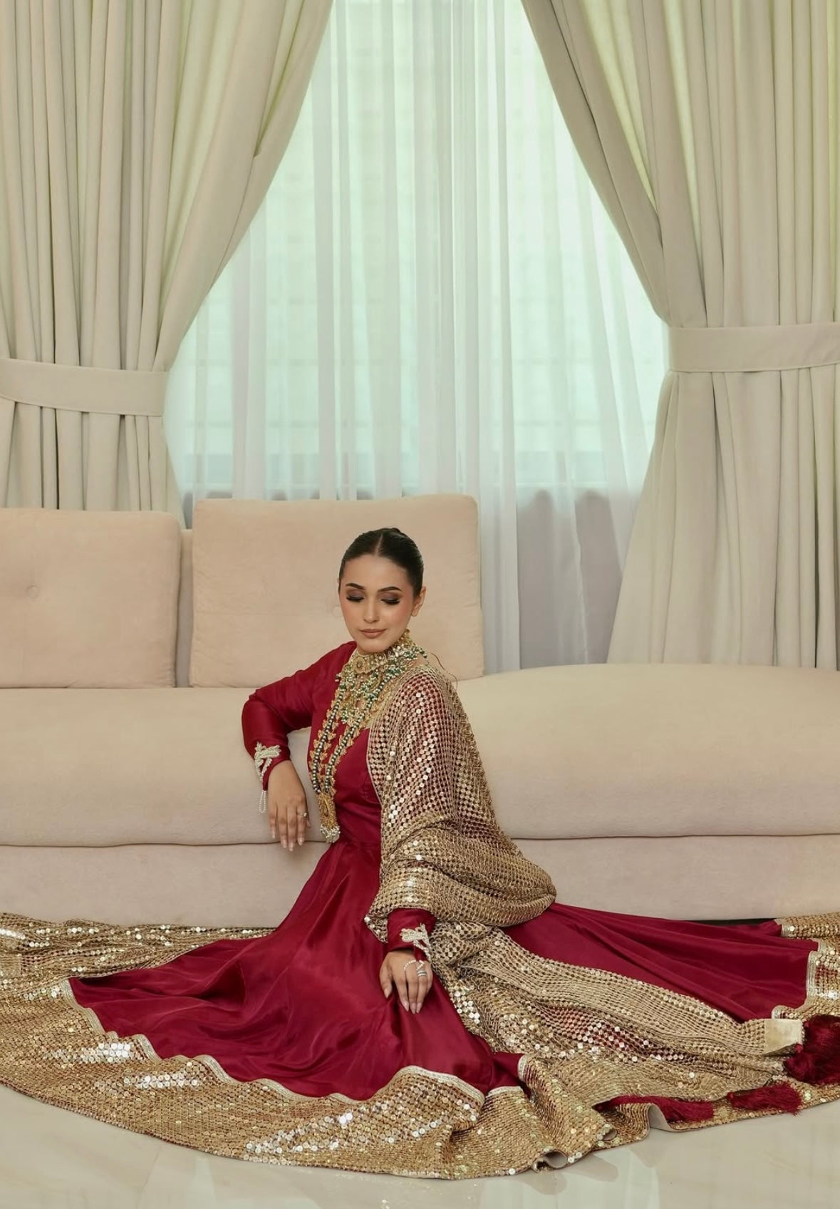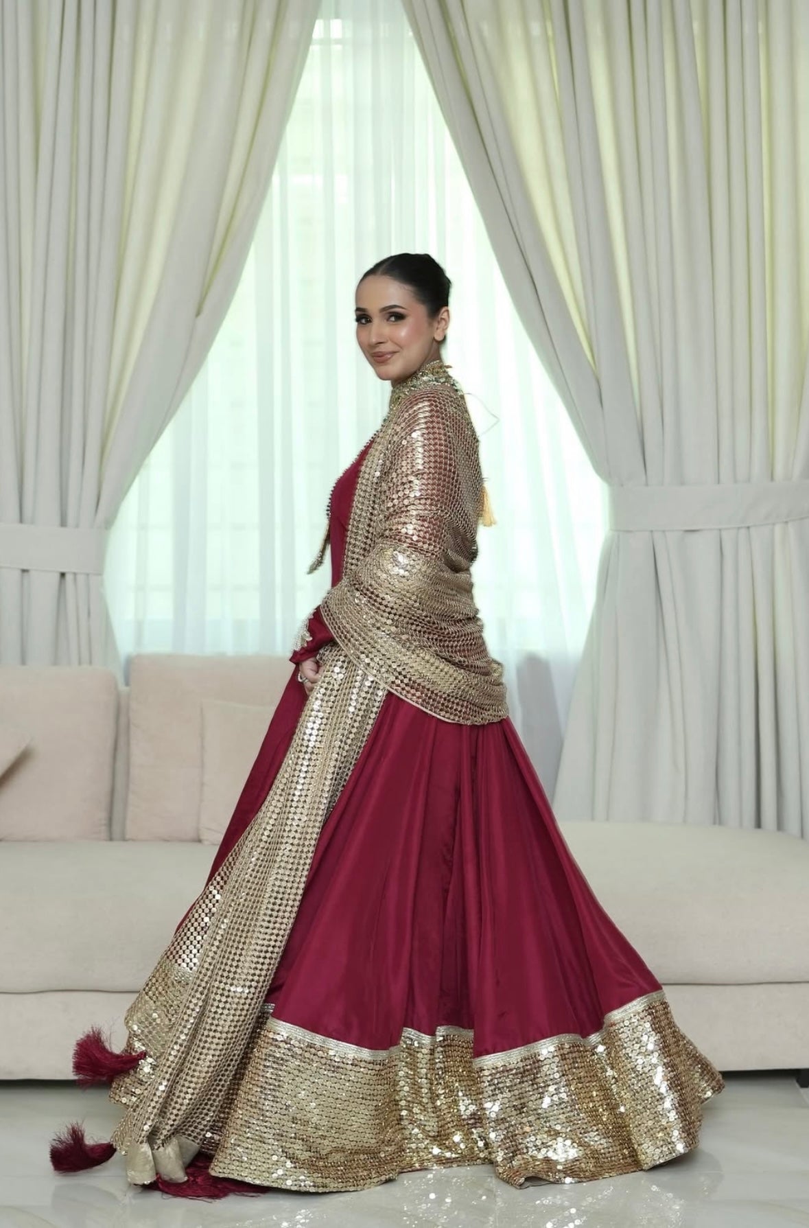 This stunning maroon and gold outfit is a trending favorite this season! ๐ The mirrorwork & sequins give it the perfect festive glam, while the flowy silhouette makes it a showstopper. The best part? ๐ You can customize this beauty in any size and color to match your dream look. Dupata is 2.5 meter yards
